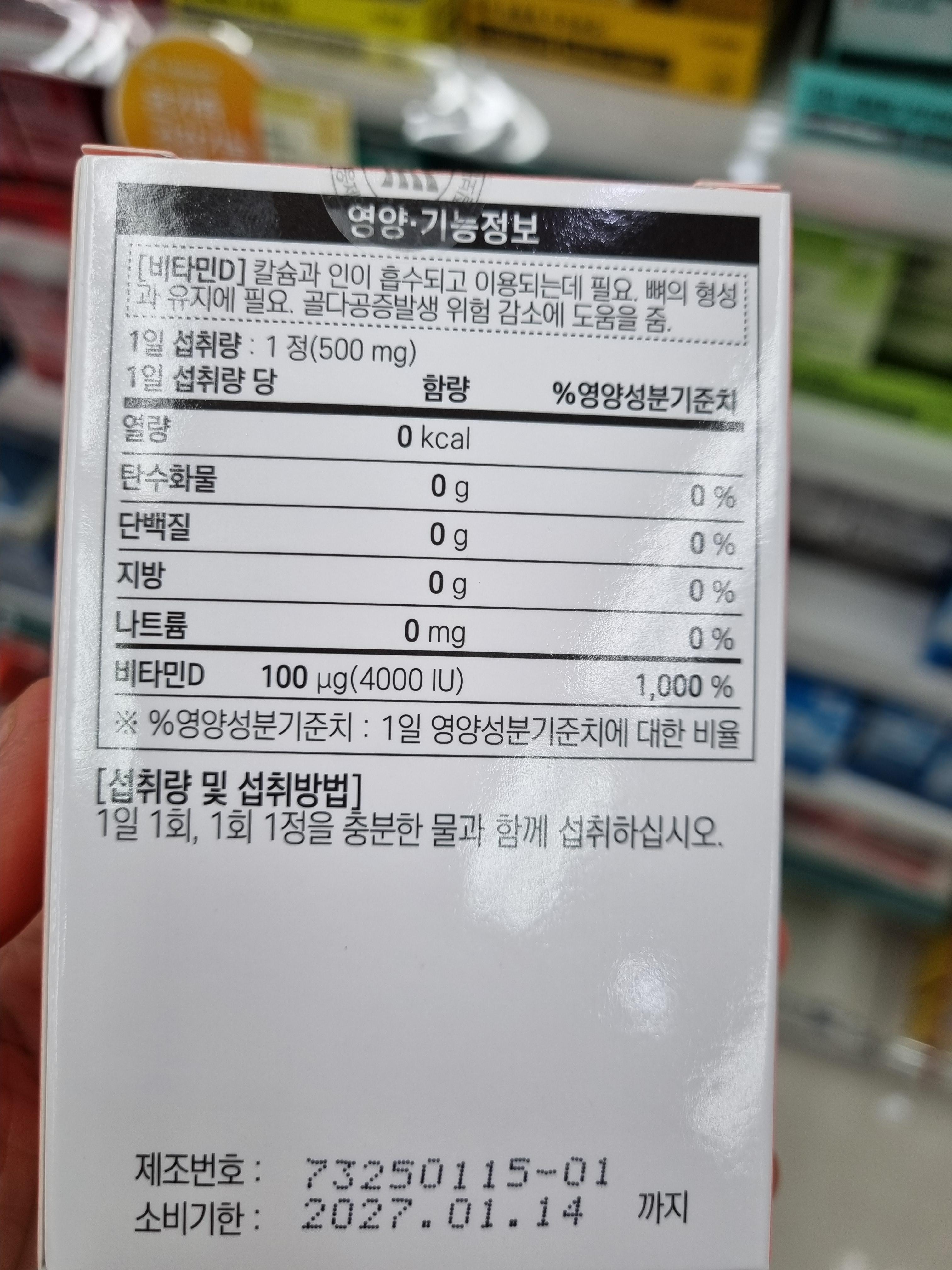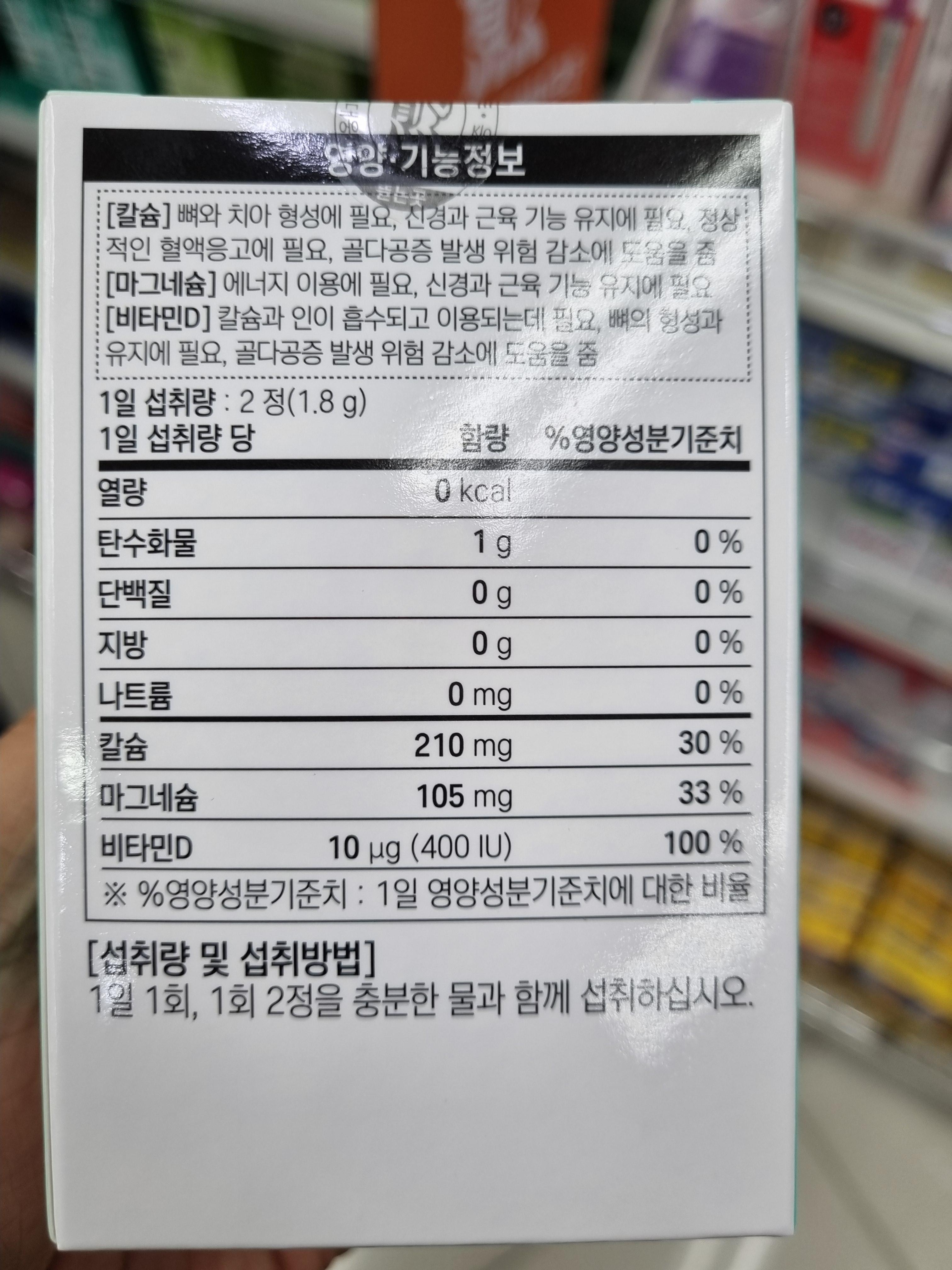 - 비타민D 10μg (400 IU) (100%): 칼슘 흡수를 돕고 뼈 건강 유지.