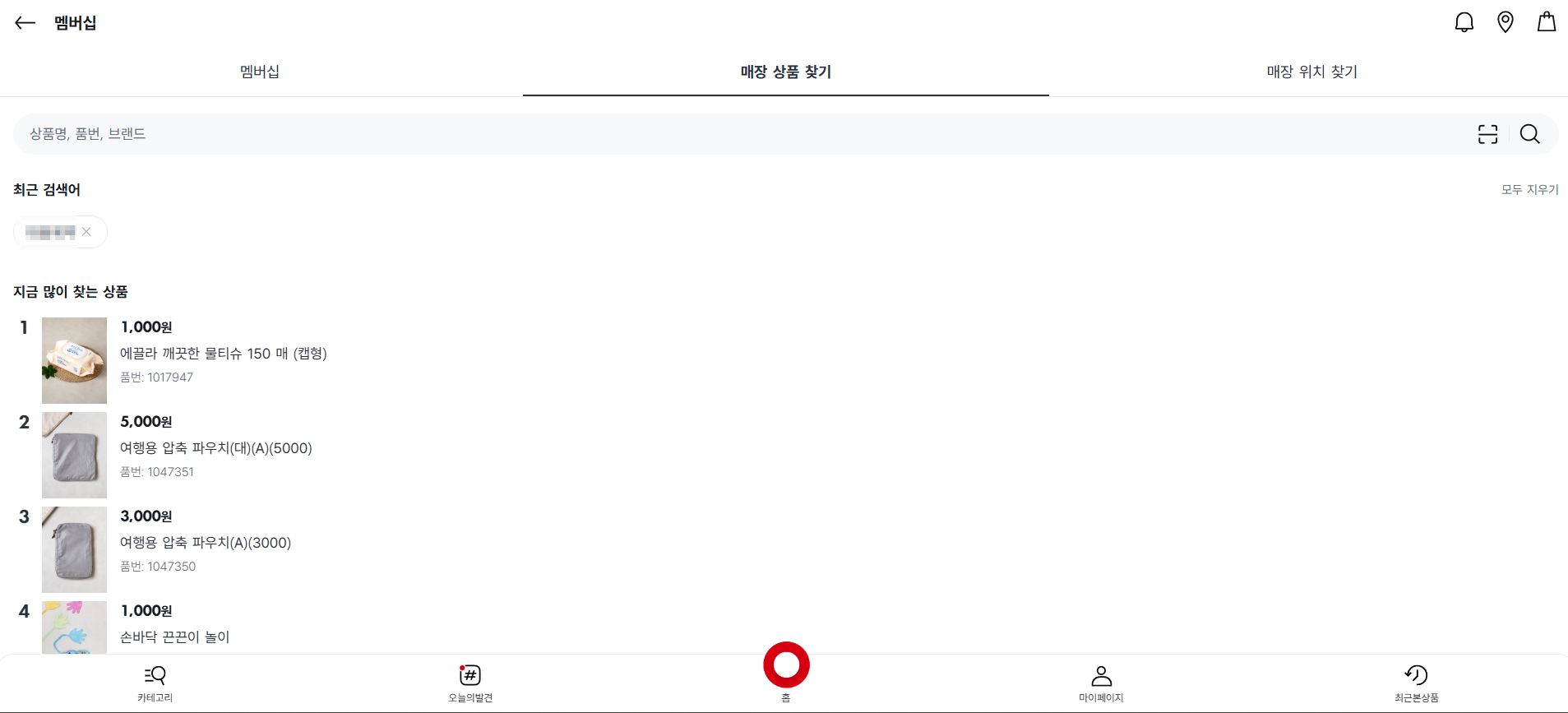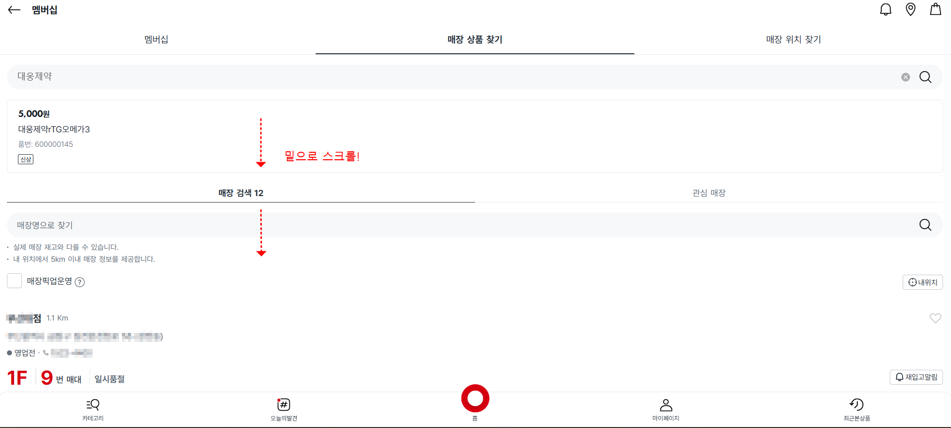 검색 결과에서 원하는 상품을 클릭하면 상세 페이지가 열립니다. 밑으로 스크롤하면, 가까운 거리의 매장순으로 해당 상품의 취급유무, 취급 시 위치와 품절여부를 알 수 있습니다.